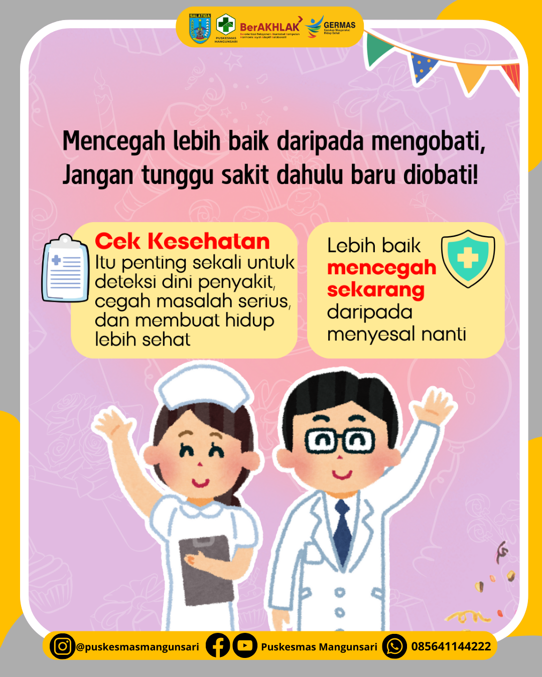 💡Yuk! manfaatkan kesempatan ini untuk cek kondisi kesehatan tubuhmu. Karena cek kesehatan itu penting sebagai deteksi dini penyakit, cegah masalah kesehatan serius, dan membuat hidup lebih sehat. Lebih baik mencegah sekarang daripada menyesal nanti!
