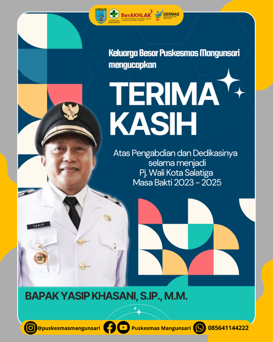 Kami segenap Keluarga Besar Puskesmas Mangunsari mengucapkan terima kasih atas Pengabdian dan dedikasi Bapak Yasip Khasani, S.I.P., M.M sebagai Penjabat (Pj) Wali Kota Salatiga masa bakti 2023-2025.