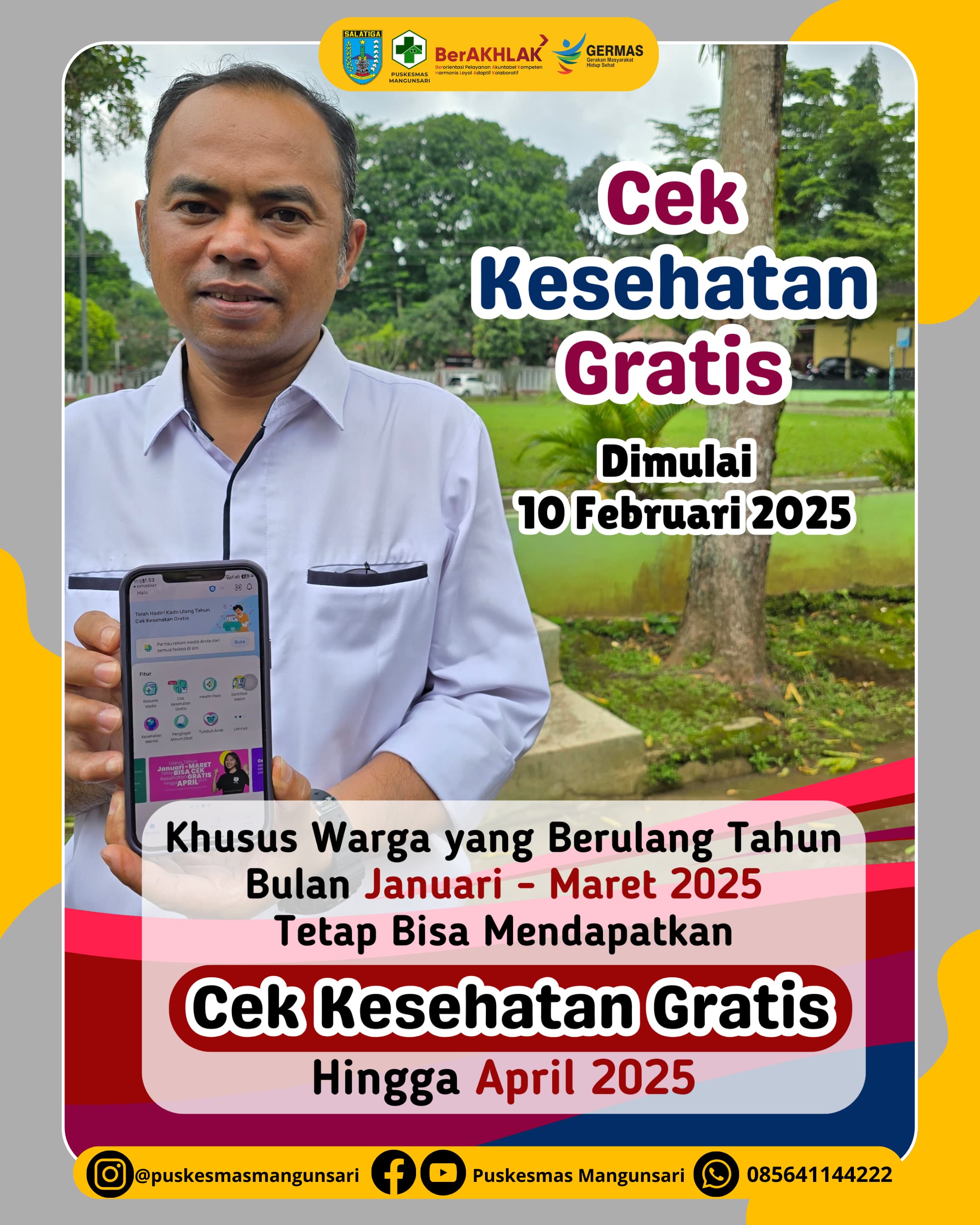 Salam Sehat Sehati! Cek kesehatan gratis sudah bisa dilakukan nih, Sobat Sehat 😍 Buat kamu yang berulang tahun, gasken ke Puskesmas terdekat untuk dapat melakukan cek kesehatan gratis yaa. Pastikan Sobat Sehat sudah mengunduh dan mendaftar di Satu Sehat Mobile sebelum mendapatkan fasilitas ini 😉