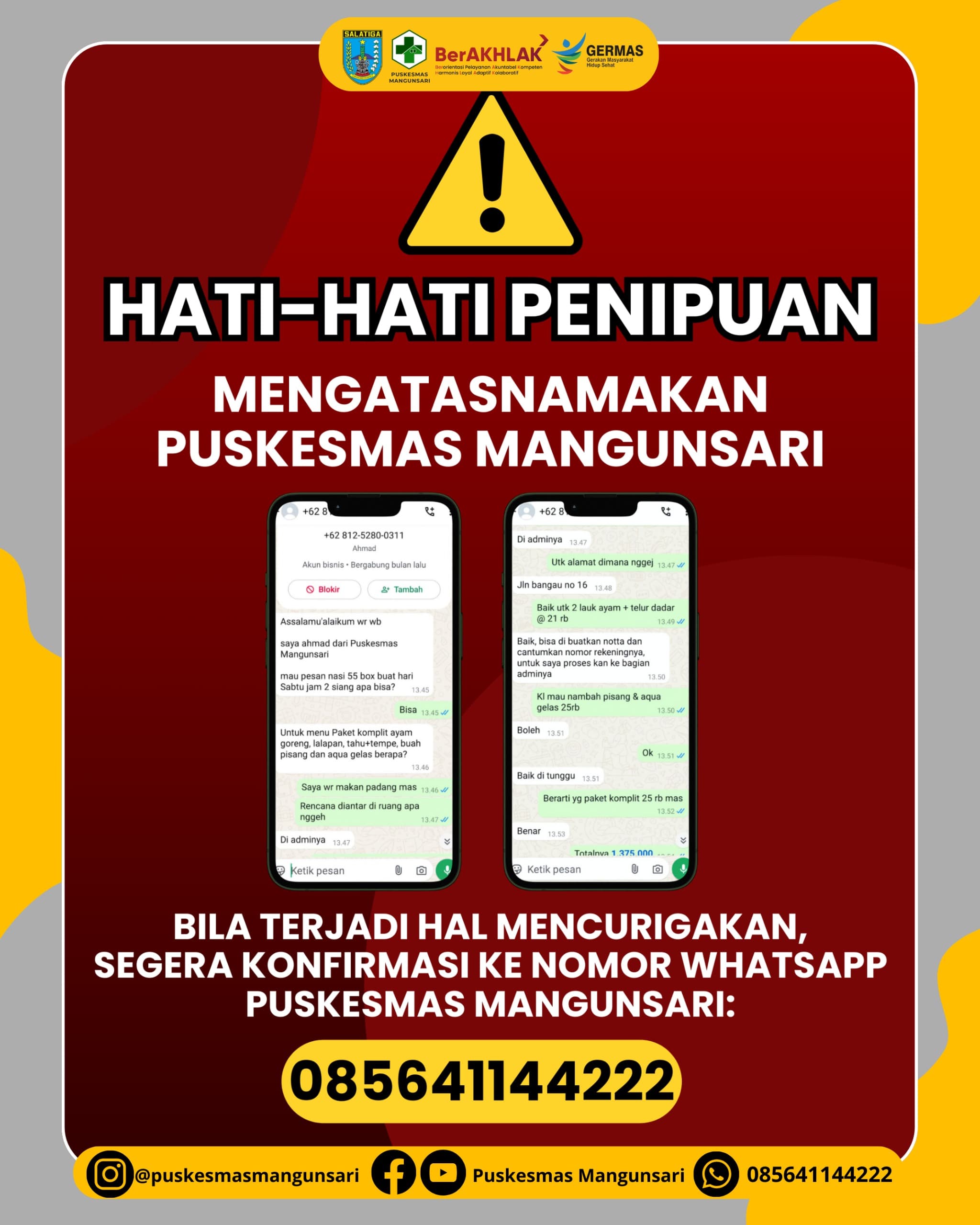 Pengumuman menghimbau untuk waspada dengan adanya penipuan yang mengatasnamakan Puskesmas Mangunsari. Bila ada hal yang mencurigakan silakan bisa langsung hubungi petugas Puskesmas Mangunsari.