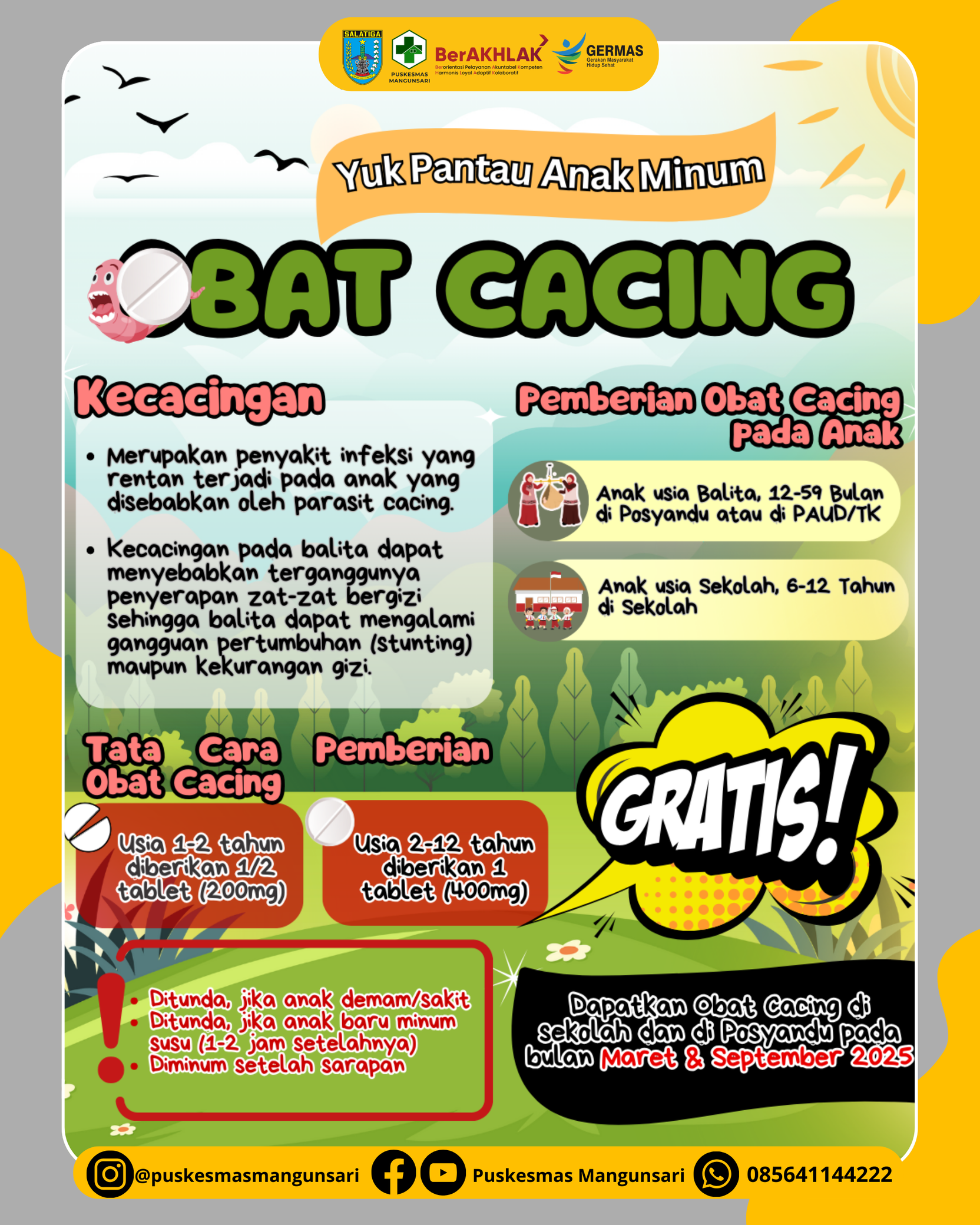 Pada tahun ini di wilayah kerja Puskesmas Mangunsari pemberian obat cacing diberikan pada bulan Maret dan September 2025.