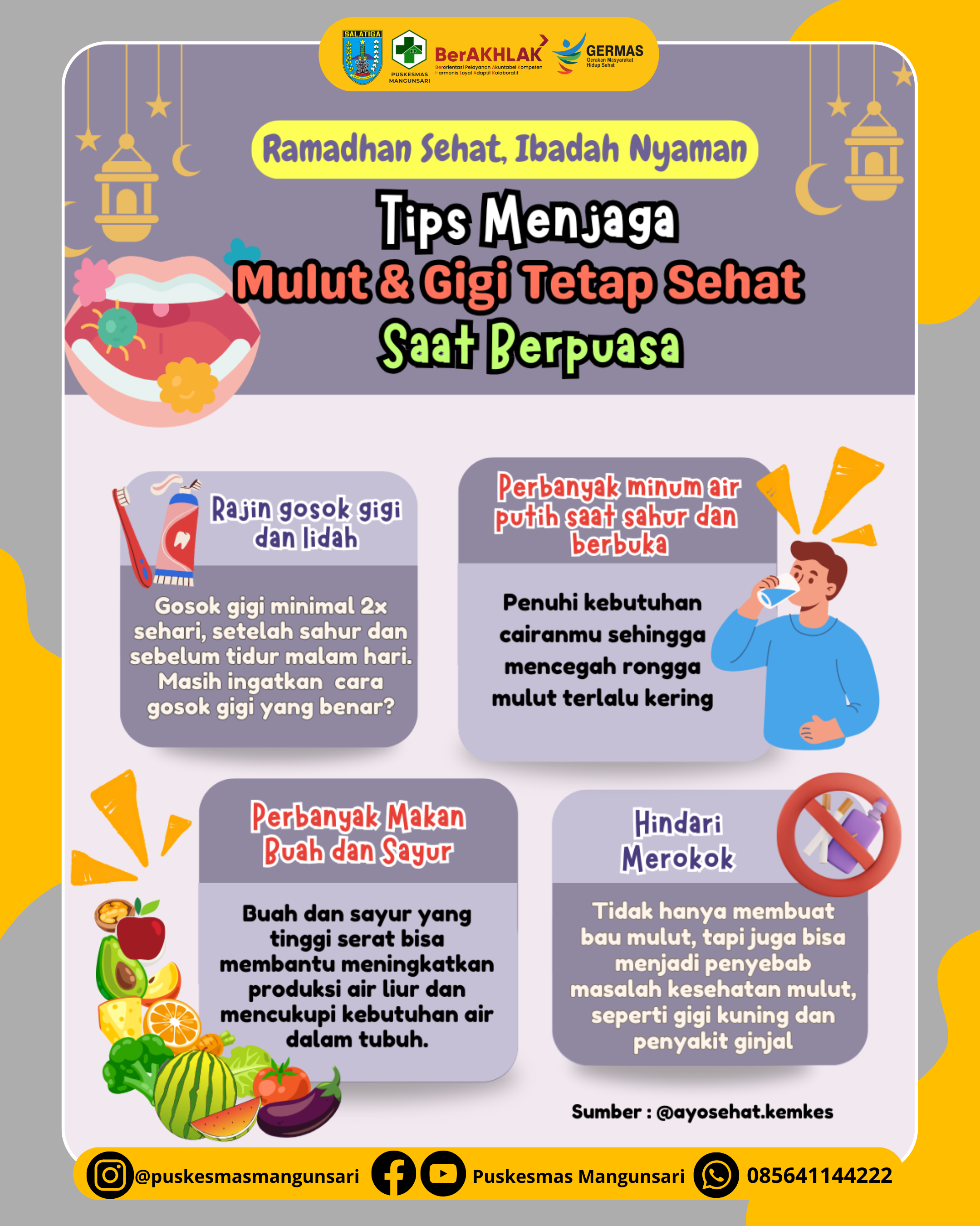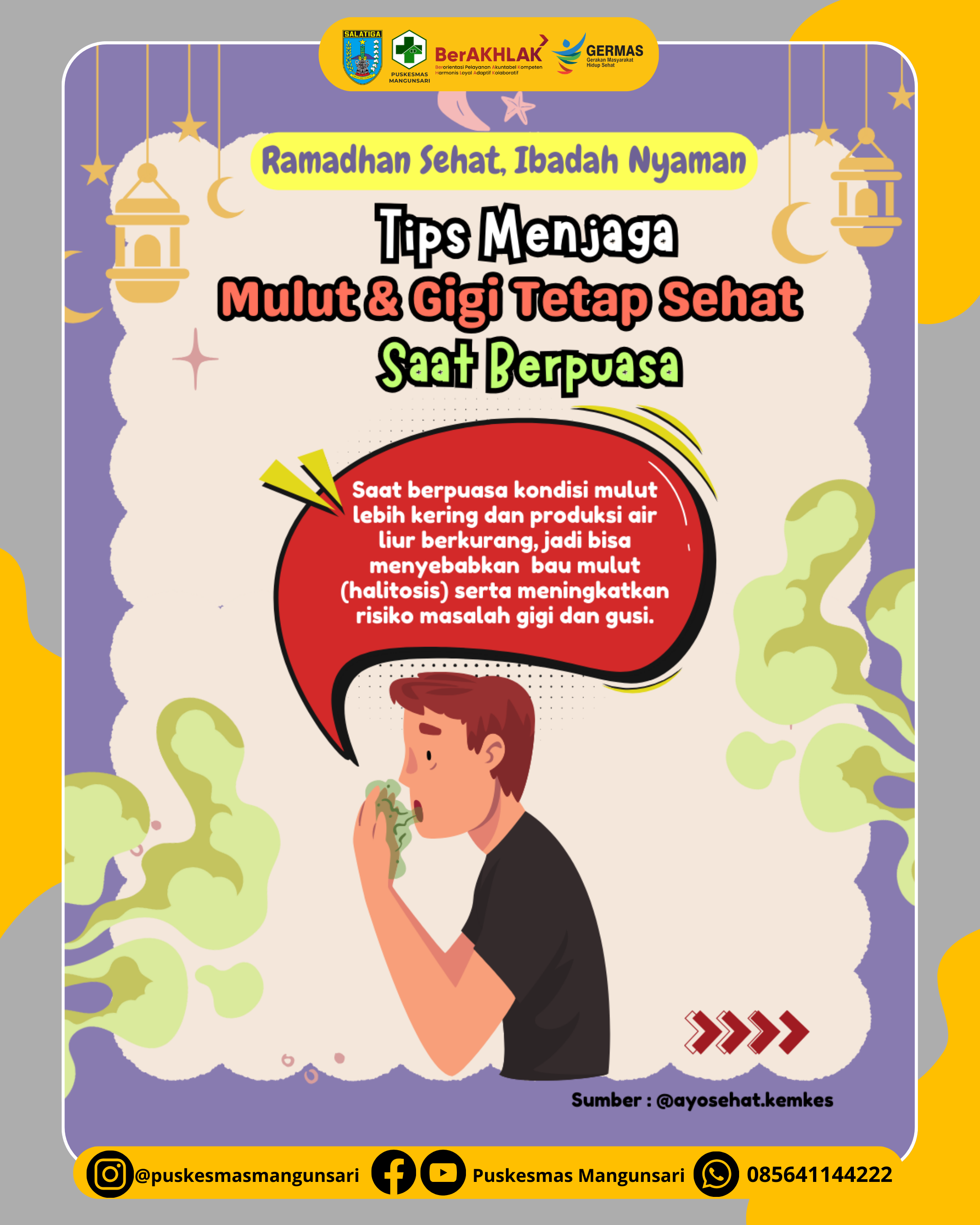Untuk menjaga agar puasa tetap sehat dan ibadah nyaman salah satunya kita perlu menerapkan gaya hidup yang sehat. Jangan sampai masalah kecil yang sepertinya sepele jadi mengganggu ibadah kamu selama di bulan Ramadhan. Dan jangan abaikan juga kesehatan mulut dan gigi karena kalau tidak ditangani dengan tepat bisa bahaya⚠️