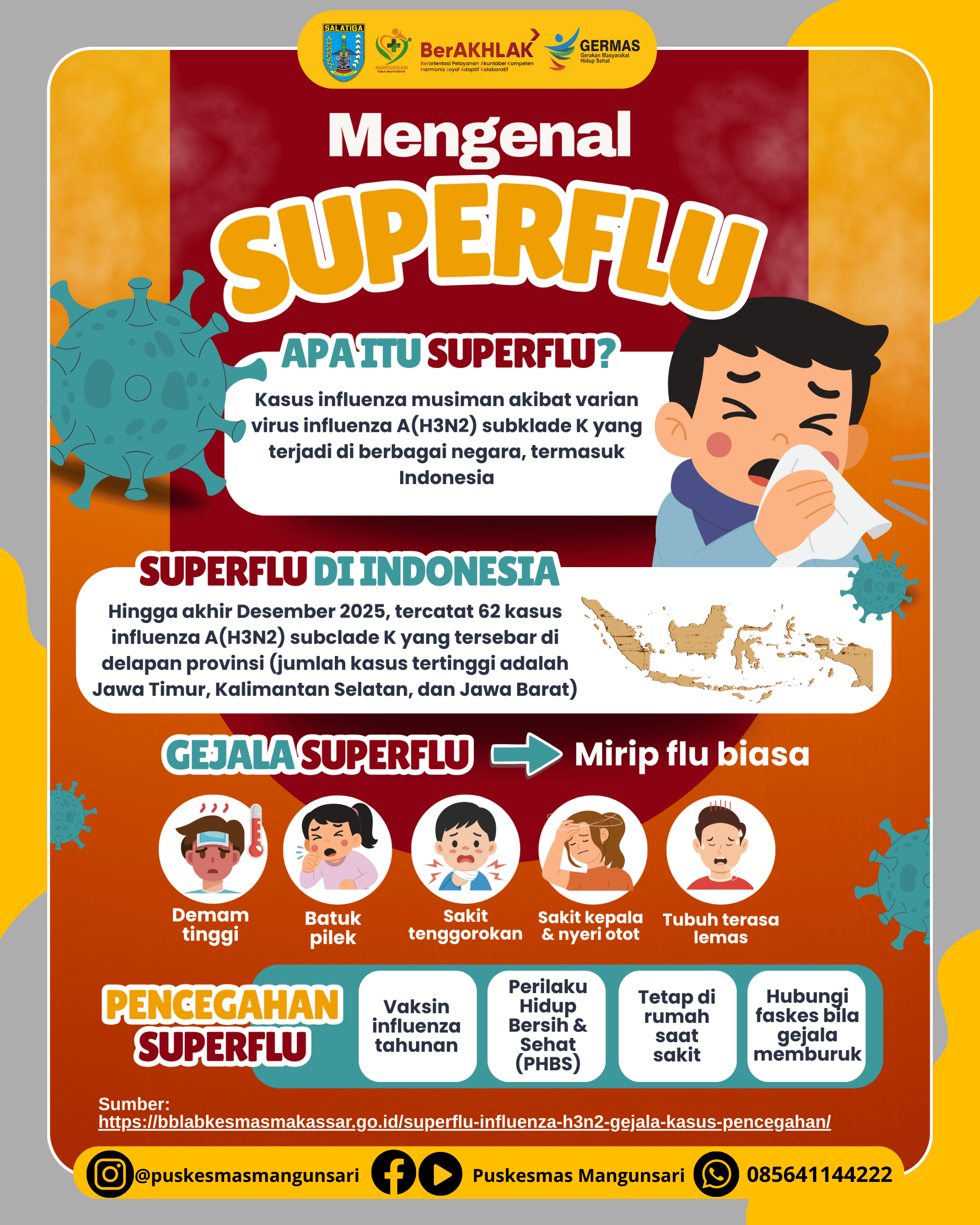 Superflu atau influenza A(H3N2) subclade K sudah terdeteksi di Indonesia sejak Agustus 2025 melalui pemantauan rutin Kementerian Kesehatan RI, dengan total 62 kasus tercatat di delapan provinsi hingga akhir Desember 2025. Kemenkes memastikan istilah “superflu” bukan jenis penyakit baru dan situasi nasional masih terkendali, serta gejala yang timbul umumnya serupa influenza musiman seperti demam, batuk, dan pilek.