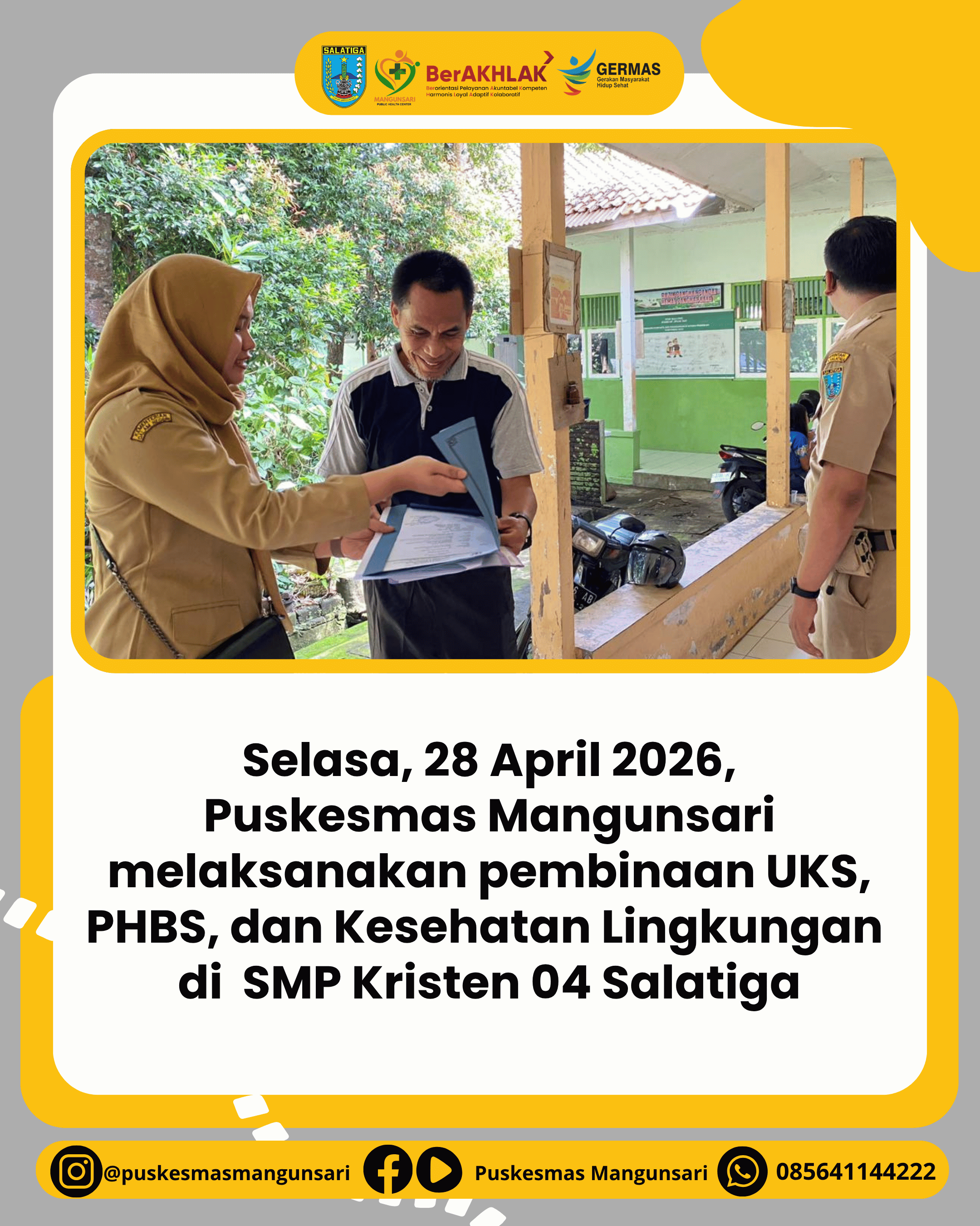 Selasa, 28 April 2026 Puskemas mangunsari kembali melakukan Pendataan PHBS, Pembinaan UKS dan Pemeriksaan Lingkungan Sekolah di SMP Kristen 04 Salatiga