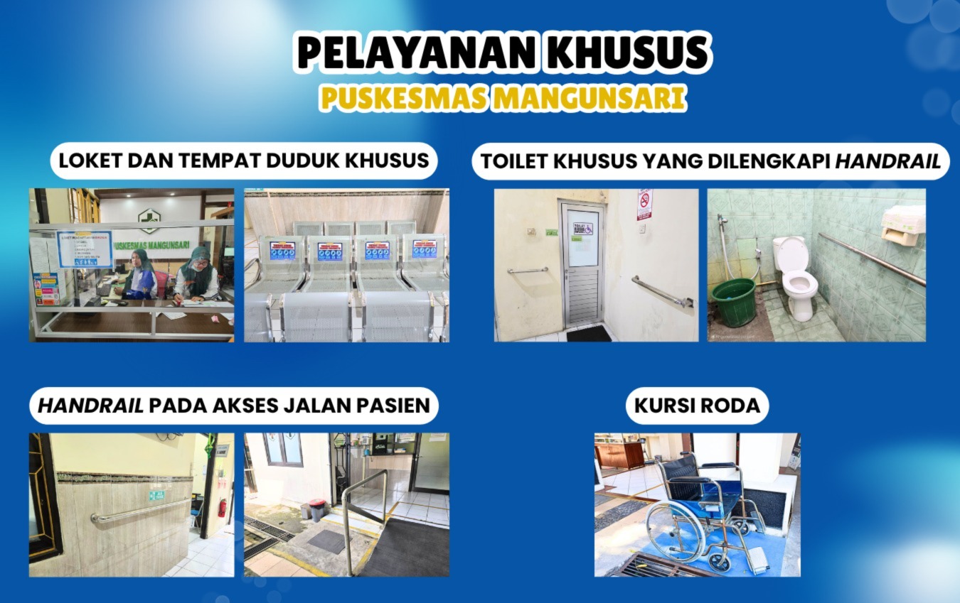 Puskesmas Mangunsari terus berkomitmen memberikan pelayanan kesehatan yang inklusif bagi seluruh lapisan masyarakat, termasuk penyandang disabilitas. Sebagai bentuk implementasi dari Undang-Undang Nomor 8 Tahun 2016 tentang Penyandang Disabilitas, Puskesmas Mangunsari menyediakan pelayanan khusus yang ramah disabilitas, baik dari segi fasilitas fisik seperti jalur kursi roda, toilet aksesibel, maupun dari sisi pelayanan seperti adanya petugas yang telah dilatih untuk melayani pasien disabilitas dengan empati dan profesionalisme. UU No. 8 Tahun 2016 mengamanatkan bahwa penyandang disabilitas memiliki hak yang sama dalam memperoleh layanan kesehatan tanpa diskriminasi, dan hal ini menjadi acuan penting dalam pengembangan layanan di Puskesmas.